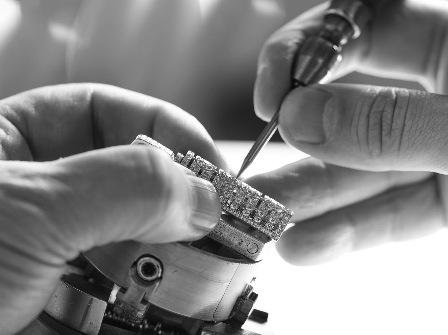 Luxurious and romantic, this 18K rose gold wedding band features five lines of channel-set diamonds, each carefully positioned to create an unbroken river of light. The diamonds' radiance is amplified by the rose gold setting, producing a piece that is both opulent and enchanting.